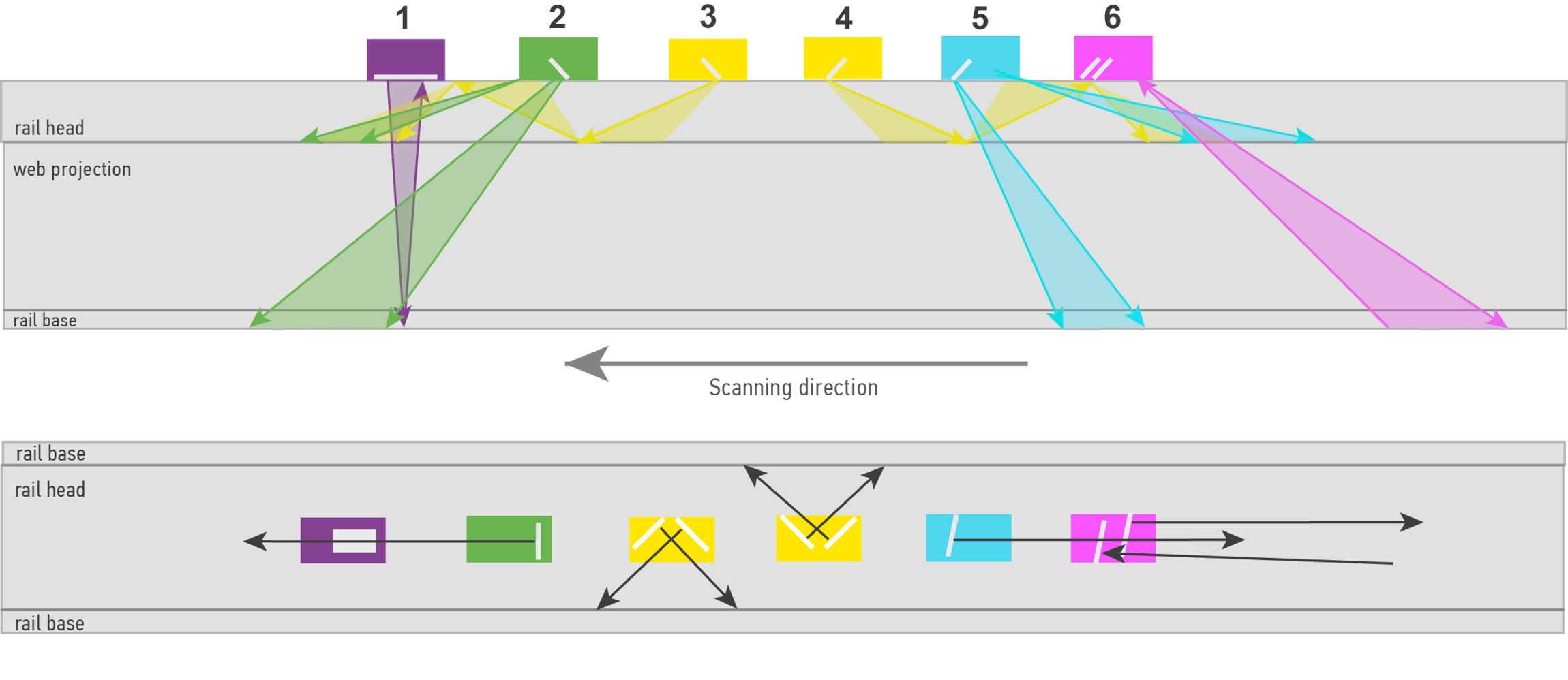 The ultrasonic phased array method (PAUT) and the ultrasonic low-frequency echo-method are used to scan railway tracks (R50, R65, R75 UIC52, UIC60, etc.).