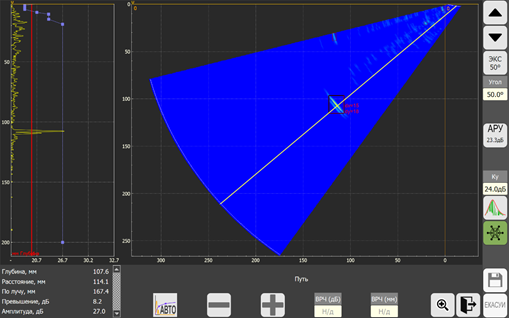 Supplementary inspection is carried out using a manual detector of phased arrays with an entry angle range of 36-75 degrees. The inspection results are recorded in the form of defectograms in the protocol