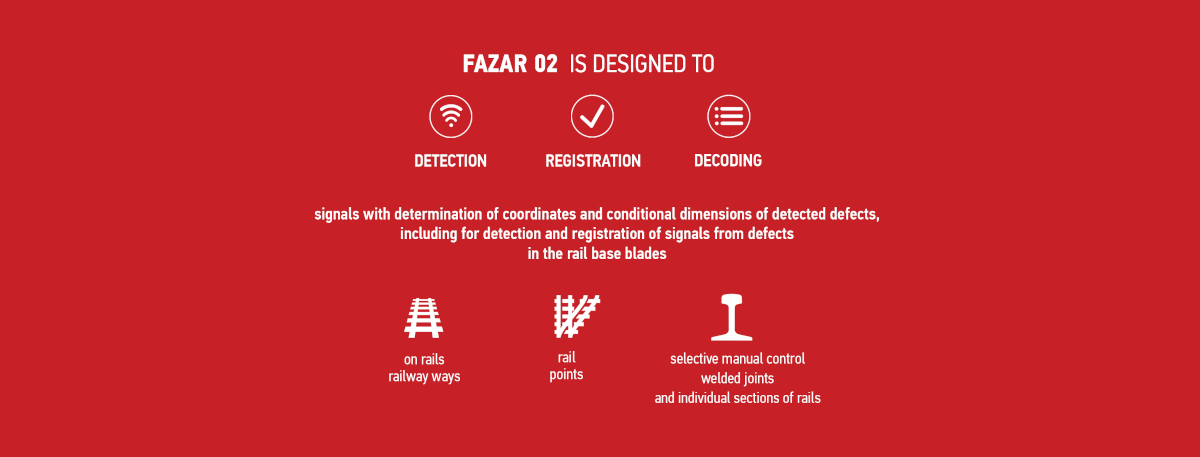 The FAZAR 32+ (DL) is designed for detection, registration and decoding of signals with determination of coordinates and conventional dimensions of detected defects, incl. detection and registration in the base railway tracks, railway turnouts, as well as selective manual testing of welded joints and individual rail sections.